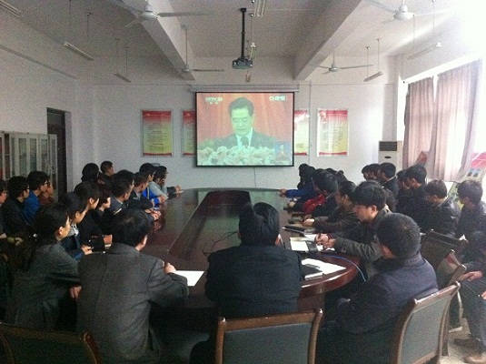 座谈会开始之前,与会领导、师生党员们以饱满的热情集中观看了党的十八大开幕式。