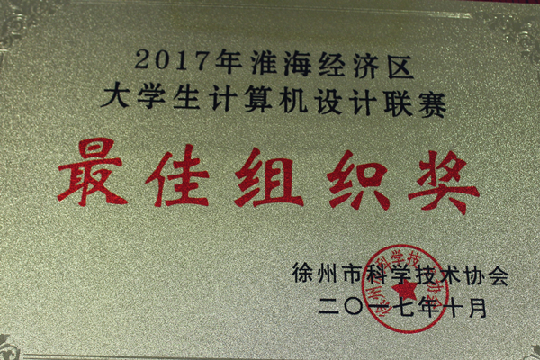 10月14-15日,由徐州市科技协会主办,徐州工程学院、徐州计算机学会承办的第二届淮海经济区大学生计算机设计联赛在徐州工程学院举行。我校信息与电气工程学院组织参加了C程序设计赛项和Java程序设计赛项2项个人赛和团体赛;共获得个人赛特等奖1项,团队赛一等奖1项,二等奖1项,三等奖1项。同时学校被组委会授予了 “最佳组织奖”。
