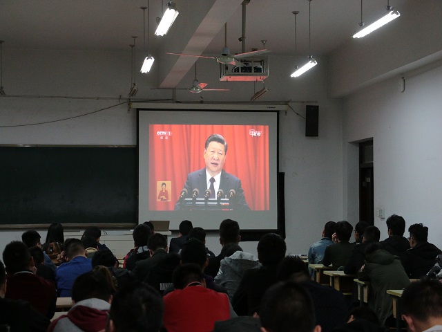 10月18日下午3点,机电工程学院部门老师和学生代表共同在教室观看了党的十九大开幕会,大家牢记党的十九大的主题“不忘初心、牢记使命,高举中国特色社会主义伟大旗帜,决胜全面建成小康社会,夺取新时代中国特色社会主义伟大胜利,为实现中华民族伟大复兴的中国梦不懈奋斗!”
