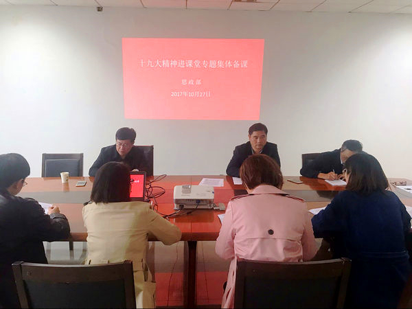 2017年10月18日,中国共产党第十九次全国代表大会在北京隆重开幕,习近平代表第十八届中央委员会向大会作了题为《决胜全面建成小康社会 夺取新时代中国特色社会主义伟大胜利》的报告。 十九大召开以来,全体思政教师以各种形式聆听了报告,并对十九大报告内容进行深入系统的学习研读;为进一步统一思想、明确要求,迅速推进党的十九大精神进课堂进头脑工作,10月27日下午,思政部组织全体教师专题召开“党的十九大精神进课堂”集体备课会。