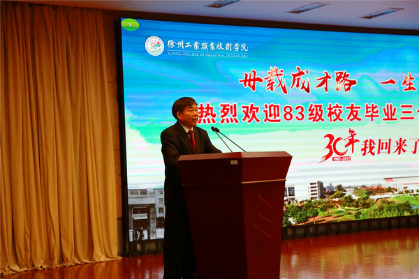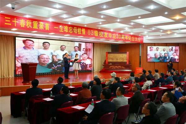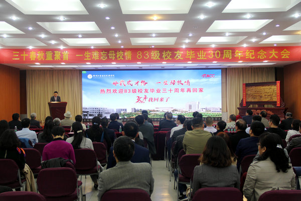 上午9点,83级校友毕业三十周年纪念大会在校图书馆多功能厅隆重召开,院长张登宏,党委副书记李红,副院长鲍桂楠、张芳儒、朱作付,原徐州化工学校校长顾明华以及原学院党委书记周立雪出席大会;各职能部门、二级学院相关领导,毕业班班主任、相关老教师以及83级全体校友参加了会议。大会由副院长鲍桂楠主持。