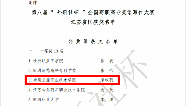 10月28日,第八届“外研社杯”全国高职高专英语写作大赛(江苏赛区)在南京举行;我校高分子161班 李牧聪同学(米芙铮老师指导)以全省第3名的成绩荣获公共英语组一等奖,将于12月份代表江苏省赴北京参加决赛。此外,机械制造与自动化151班刘玲玲同学(韩善化老师指导)荣获三等奖,位列全省49名。