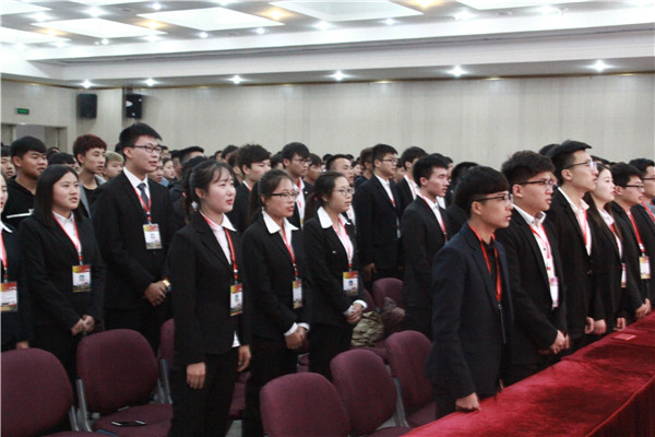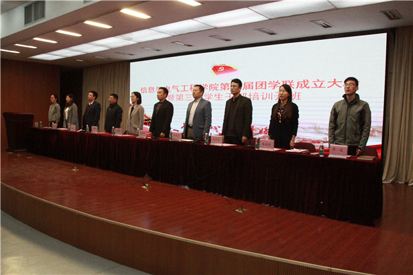 会议在庄严的国歌声中拉开序幕。首先,副院长王方杰老师宣读了信息与电气工程学院第二届团学联优秀学生干部标兵、优秀学生干部名单,出席会议的老师在激昂的音乐声中为获奖学生干部颁发荣誉证书。接着,第二届学生会主席石善洲作工作总结,他总结了过去一年第二届团学联全体成员在工作中取得的累累硕果,分享了工作经验,并对新一届成员提出了希望。随后,党总支书记丁振华老师宣读了第三届团学联学生干部名单。学工处处长张海波老师为第三届团学联学生干部颁发聘书、佩戴工作证,对新一届学生干部表示祝贺并激励他们锐意进取,勇于拼搏。