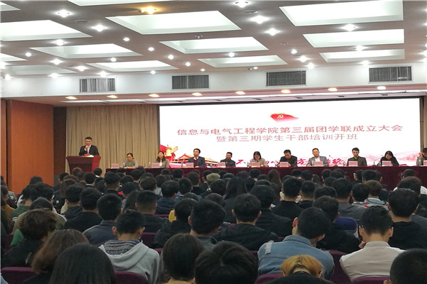 11月2日,信息与电气工程学院第三届团学联成立大会暨第三期学生骨干能力提升培训班开班仪式在图书馆多功能厅隆重召开。学工处处长张海波,校团委书记张妍妍,信息与电气工程学院院长陈祥章、党总支书记丁振华、副院长王方杰、副院长徐忠杰、各年级辅导员老师以及校学生会、校社团联合会、各二级学院学生会、社团联合会主席出席了本次大会。会议由信息与电气工程学院团总支书记庞世华主持。