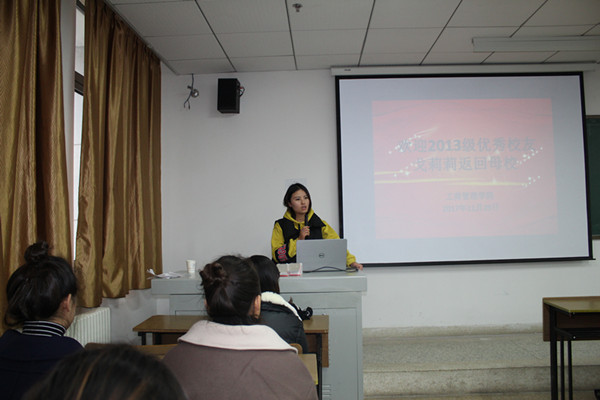戈莉莉校友讲述了自己家境困难,愈加珍惜来之不易的大学时光。在大学期间通过课外阅读、参加活动、校外兼职等方面不断充实自己,使自己的综合素质能力得到较大的提升。在进入校企合作单位南京中广置业有限公司之后,凭借丰富的知识和能力,她踏实工作,遇到问题不畏难、不退缩,善于运用学到的知识分析问题和解决问题,一年时间从普通业务员升到门店经理。生动的讲述获得在场师生的一阵阵掌声。她勉励学弟学妹在校期间要努力学习专业知识、积极参与学校活动、学会规划人生,提高综合能力素质,努力做一个有志向、有规划、懂感恩和敢担当的人。