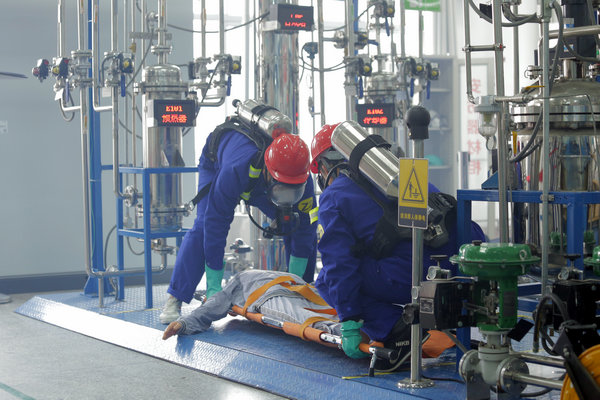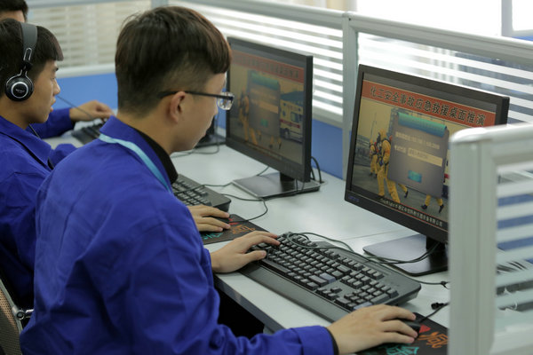 “现代化工HSE技能竞赛”包括“HSE理论知识考核”、“化工安全事故应急救援桌面推演”以及“体感式HSE装置操作”三个竞赛单元。HSE技能竞赛“桌面推演”项目选取重特大化工安全事故案例,采用3D动画技术模拟事故场景,参赛队员自主选取角色,执行人物指令,进行隐患排除、事故处置和应急救援等技术活动。HSE理论知识考核个人对化工安全、环境保护和职业卫生等方面的知识与技术及法规的掌握。“体感式HSE装置操作”项目采用了班组联合操作,用电子脉冲信号模拟物料投放,用声光电气模拟安全事故环境,在仿真实景中,进行安全事故处置操作。