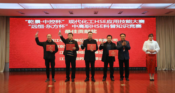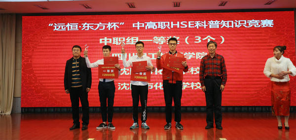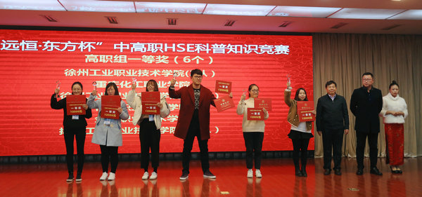 12月1日19:00,中国化工教育协会秘书长、全国石油和化工职业教育教学指导委员会副主任兼秘书长于红军,全国石化行指委化工安全及环保类专指委主任周立雪, 徐州工业职业技术学院院长张登宏等各界领导出席了闭幕式,并对获奖的团体颁发了获奖证书和奖杯。竞赛共评选出乾景·中控杯”现代化工HSE应用技能大赛一等奖队伍3个、二等奖队伍7个、三等奖队伍9个,其中徐州工业职业技术学院、河南化工技师学院、兰州石化职业技术学院三支参赛队斩获现代化工HSE应用技能大赛一等奖;“远恒·东方杯”中高职HSE科普知识竞赛一等奖队伍9个、二等奖队伍21个、三等奖队伍32个,其中徐州工业职业技术学院科普1、2队、重庆化工职业学院科普队、杭州职业技术学院、金华职业技术学院、扬州工业职业技术学院科普2队,共六支参赛队斩获高职科普知识竞赛一等奖殊荣;四川理工技师学院科普队、沈阳市化工学校科普队、沈阳市化工学校科普队三支参赛队斩获中职科普知识竞赛一等奖殊荣。