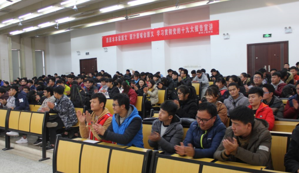 宣讲开始,全体老师和同学起立肃穆,默哀三分钟,表达对南京大屠杀30多万死难同胞的沉痛追忆。默哀礼毕后,陈书记回顾了中国近代的发展历程,从“站起来、富起来、强起来”对中华民族伟大复兴的历史背景进行了高度概括,从十九大报告文本原意出发,贯穿“主题和主要成果、党的指导思想、历史成就和历史变革、新时代的新特点、社会主要矛盾、两个阶段、经济社会发展、党的建设”八个方面,对十九大报告进行深入解读,并对材料学院的发展提出“学生有自信心、企业有满意度、职工有幸福感”的新要求和新展望。陈书记旁征博引学识渊博,引发学生和教师浓厚的听讲热情,宣讲过程中不时报以雷鸣般的掌声。