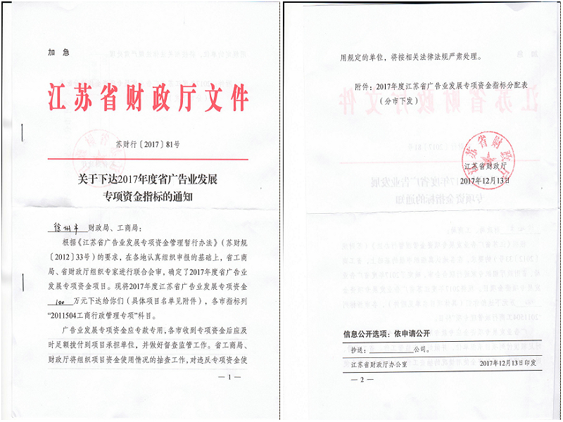近日,从江苏省财政厅获悉,大学科技园获2017年度江苏省广告业发展专项资金100万元。