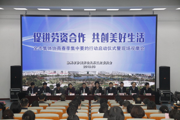 3月15日,由徐州市总工会主办、我校大学科技园和鼓楼区工会承办的全市集体协商春季集中要约行动在大学科技园会议室举办,徐州市人大常委会副主任、市总工会主席束志明,市人力资源和社会保障局局长翟彩霞,中共鼓楼区委书记龚维芳,院长张登宏、副院长鲍桂楠等领导出席此次活动。
