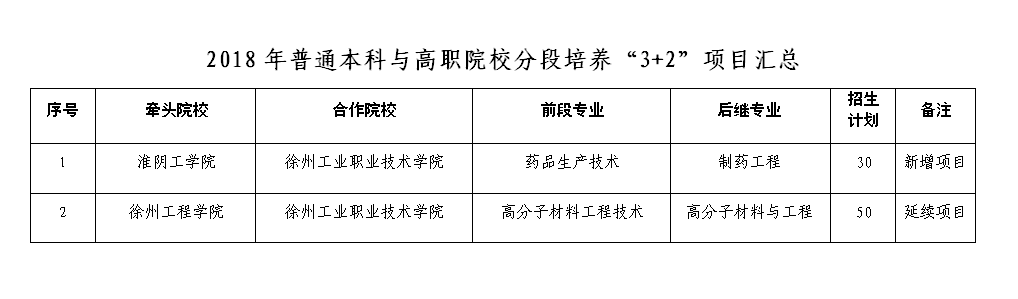 近日,从江苏省教育厅《省教育厅华体会网页版公布2018年江苏省现代职教体系建设试点项目的通知》(苏教职〔2018〕7号)文件获悉,我校2018年现代职教体系“3+3”试点项目共申报14项,获批13项,比2017年新增5项,取得历史性突破。另悉,在江苏省公布的2018 年普通本科与高职院校合作培养高素质技术技能人才项目中,我校与淮阴工学院联合申报的“药品生产技术专业”普通本科与高职院校分段培养“3+2”新增项目、与徐州工程学院联合申报的“高分子材料工程技术专业” 普通本科与高职院校分段培养“3+2”延续项目,全部获批。
