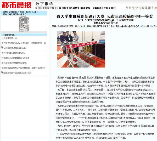 据了解,本届大赛主题是“关注民生,美好家园”,由江苏省大学生机械创新设计大赛组委会主办。包括东南大学、南京理工大学、南京航空航天大学、中国矿业大学等重点院校在内的44所江苏省高校的236支参赛队,参加了在徐州工业职业技术学院举行的第七届江苏省大学生机械创新设计大赛暨第八届全国大学生机械创新设计大赛江苏赛区预赛。