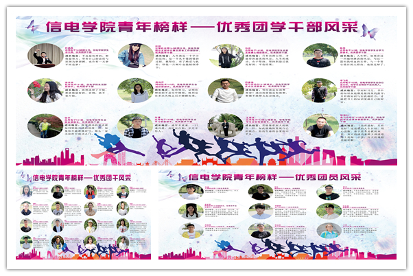 以五四表彰为契机,在全体团员、团干、学干中广泛宣传、深入挖掘出一批作风优良、成绩优秀、工作突出的青年典型,通过海报、微信平台进行展示。他们中有默默奉献的班长、团支部书记、学生会干部;有学习刻苦努力,成绩优异的学霸;有积极参加各类科技竞赛,成绩显著的小明星;也有用知识改变命运的自强自立之星等。他们坚持奋斗,用辛勤和努力为青春命名。