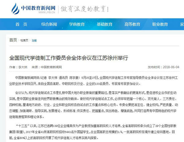 5月25至27日,全国现代学徒制工作专家指导委员会全体会议在江苏徐州工业职业技术学院召开,来自全国各高职、中职院校及行业、企业的133名委员、专家库专家参加会议。