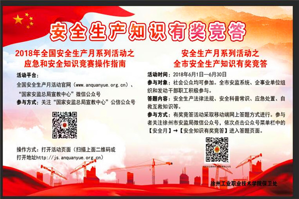 为深入开展安全生产月活动,强化“生命至上、安全发展”的主题,学校积极组织师生员工参加2018年网络安全生产月宣教活动,通过QQ、微信等网络平台动员广大师生员工参加全国及省市应急和安全知识竞赛网上答题活动。