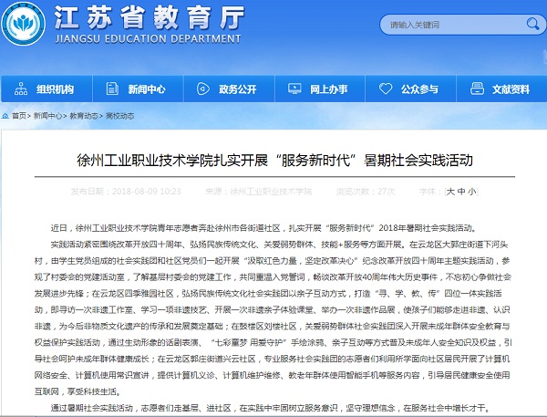 近日,徐州工业职业技术学院青年志愿者奔赴徐州市各街道社区,扎实开展“服务新时代”2018年暑期社会实践活动。