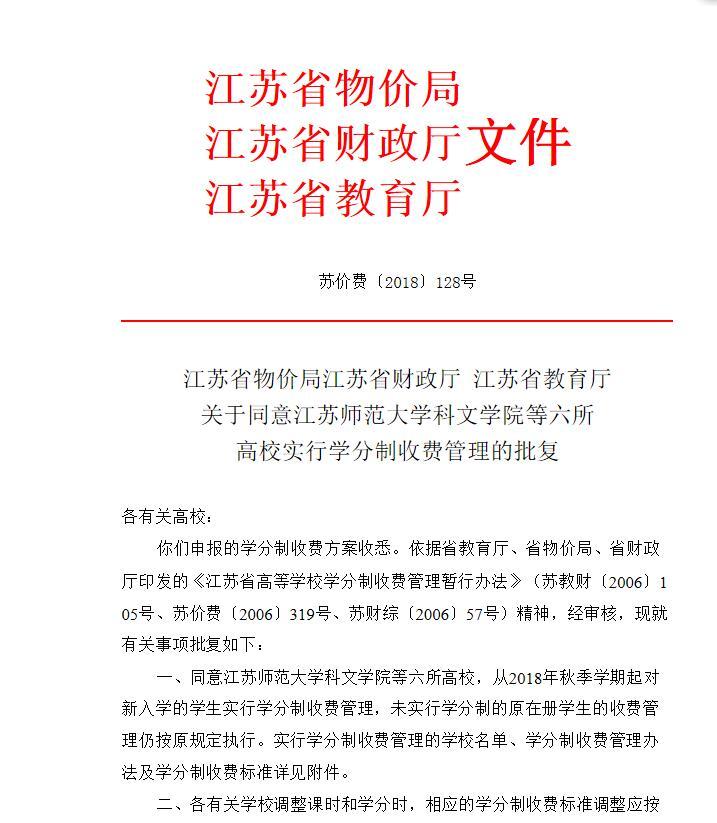 近日,江苏省物价局、江苏省财政厅、江苏省教育厅联合发文(苏价费[2018]128号)批准我校2018年秋季起实行学分学收费管理,实施学分制收费是我校学分制改革工作的重要进展,这标志着我校学分制教学改革进入了新的阶段。