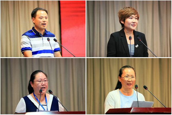 获奖教师代表詹新生、苗坤、王莉、陆英四位老师分别发言,与大家分享了他们的工作经验和工作体会。他们的发言情真意切、质朴感人,他们在平凡的岗位上做出了不平凡的业绩,为学校的发展奉献了青春和力量。