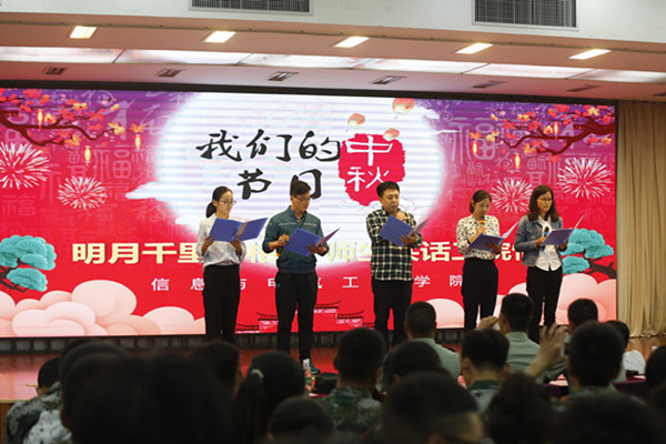 情系徐工院,温情中秋节。为深入挖掘传统节日的文化内涵和时代魅力,让同学们感受到节日的浓厚氛围以及家的温暖,正值中秋节到来之际,信息与电气工程学院开展“我们的节日·中秋”主题活动。本次活动以传统节日为载体,以“知来历、明习俗、传经典”为目标,以诗词诵读为主要形式,旨在让学生在诵读中亲近传统文化,承续传统习俗。学工处副处长安莹、王贵锋、团委副书记庞世华、信息与电气工程学院领导班子、全体辅导员、2018级班主任、全体承训教官和新生参加了此次活动,七百多名师生共同度过了一个难忘的夜晚。