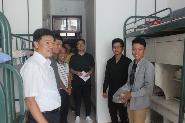 中秋节当天下午3点,由院长程建伟、党总支书记乔德阳、副院长韩永印及2018级辅导员和班主任老师拎着一袋袋包装好的月饼来到宿舍送给新生。在赠送过程中,程建伟院长亲切的询问同学们的军训体验,嘱咐同学们要努力训练,做青年先锋,并为同学们送上了甜蜜的祝福。