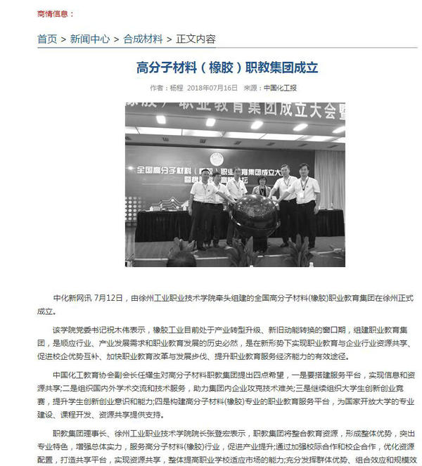 7月12日,由徐州工业职业技术学院牵头组建的全国高分子材料(橡胶)职业教育集团在徐州正式成立。