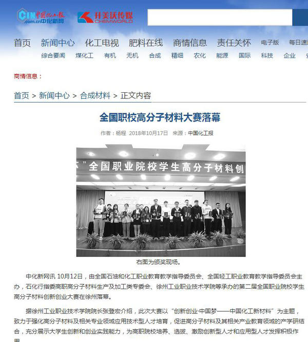 10月12日,由全国石油和化工职业教育教学指导委员会、全国轻工职业教育教学指导委员会主办,石化行指委高职高分子材料生产及加工类专委会、徐州工业职业技术学院等承办的第二届全国职业院校学生高分子材料创新创业大赛在徐州落幕。
