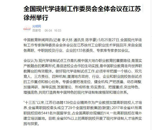5月25至27日,全国现代学徒制工作专家指导委员会全体会议在江苏徐州工业职业技术学院召开,来自全国各高职、中职院校及行业、企业的133名委员、专家库专家参加会议。