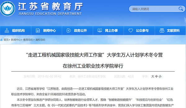 近日,江苏省高等学校“江苏智造,由我创造——走进工程机械国家级技能大师工作室”大学生万人计划学术冬令营在徐州工业职业技术学院举行,来自全省31所高校的93名营员参与活动。