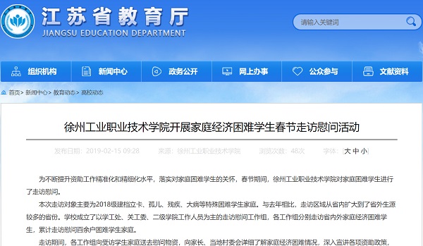 为不断提升资助工作精准化和精细化水平,落实对家庭困难学生的关怀,春节期间,徐州工业职业技术学院对家庭困难学生进行了走访慰问。