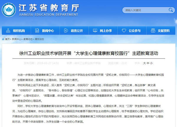 为进一步推动心理健康教育工作,徐州工业职业技术学院在全校范围内开展“坚韧之美,你我同行——大学生心理健康教育校园行”主题教育活动,提高学生心理自助、互助的能力素质。