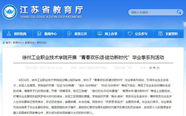6月16日,徐州工业职业技术学院经过精心组织安排,举办了“青春欢乐颂·建功新时代”毕业季系列活动,引导毕业生立志成才,实现人生理想。学院组织开展“见证·与你相遇”“成长·与你相依”“印记·与你相守”等线下活动,再现了毕业生在校精彩生活的点滴,增强学子们的母校情;开展“祝福深深,铭记工院情”“追忆时光·印记诉真情”“畅想未来·建功新时代”等线上主题活动,叮嘱毕业生要担负起筑梦伟大时代的使命,实现工匠报国的愿景。学院组织开展“身份·使命”党员毕业生座谈会,嘱咐党员毕业生步入社会后要铭记党员身份,牢记历史使命,奋勇拼搏,永当先锋。班级举办“怀梦想·致远方”主题班会课。毕业生们表示,毕业季系列活动培养了毕业生爱校荣校、爱国报国的赤子情怀,激励他们更好地肩负起新时代赋予的责任和历史使命,自觉把个人的理想追求融入到国家和民族事业中,努力成为担当民族复兴大任的时代新人。