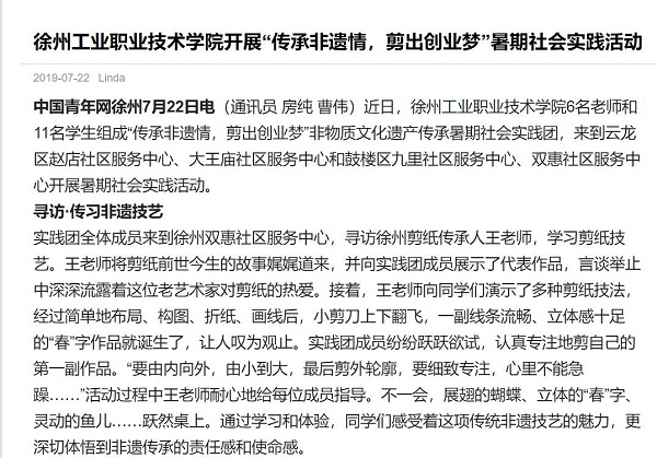近日,徐州工业职业技术学院6名老师和11名学生组成“传承非遗情,剪出创业梦”非物质文化遗产传承暑期社会实践团,来到云龙区赵店社区服务中心、大王庙社区服务中心和鼓楼区九里社区服务中心、双惠社区服务中心开展暑期社会实践活动。