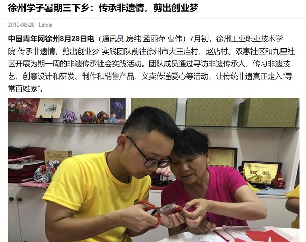 7月初,徐州工业职业技术学院“传承非遗情,剪出创业梦”实践团队前往徐州市大王庙村、赵店村、双惠社区和九里社区开展为期一周的非遗传承社会实践活动。团队成员通过寻访非遗传承人、传习非遗技艺、创意设计和研发、制作和销售产品、义卖传递爱心等活动,让传统非遗真正走入“寻常百姓家”。