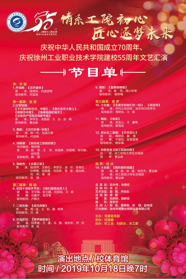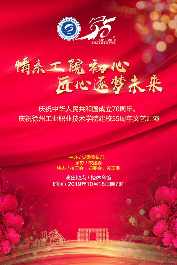 为庆祝我校建校55周年,由宣传部主办,校团委承办,校工会、妇委会、关工委协办的“情系工院初心 匠心筑梦未来——庆祝中华人民共和国成立70周年、庆祝徐州工业职业技术学院建校55周年文艺汇演”将于10月18日晚19点在校体育馆举行,学校将同时进行网络直播,届时欢迎广大师生共同观看演出。