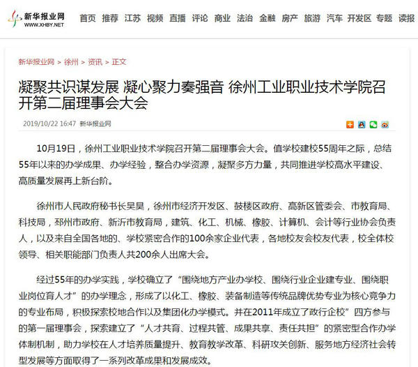 10月19日,徐州工业职业技术学院召开第二届理事会大会。值学校建校55周年之际,总结55年以来的办学成果、办学经验,整合办学资源,凝聚多方力量,共同推进学校高水平建设、高质量发展再上新台阶。