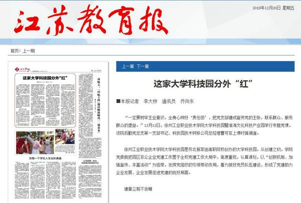 徐州工业职业技术学院党委书记祝木伟说:“这些年,我们始终坚持非公党建就是生产力的理念,推动非公党建工作融入生产经营、人才培养、企业文化,实现了党建工作和企业发展同步推进,相关工作得到了徐州市委组织部认可,园区党总支被市委组织部确立为‘非公党建示范点’。”