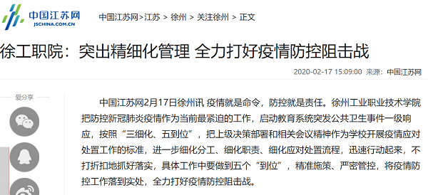 疫情就是命令,防控就是责任。徐州工业职业技术学院把防控新冠肺炎疫情作为当前最紧迫的工作,启动教育系统突发公共卫生事件一级响应,按照“三细化、五到位”,把上级决策部署和相关会议精神作为学校开展疫情应对处置工作的标准,进一步细化分工、细化职责、细化应对处置流程,迅速行动起来,不打折扣地抓好落实,具体工作中要做到五个“到位”,精准施策、严密管控,将疫情防控工作落到实处,全力打好疫情防控阻击战。