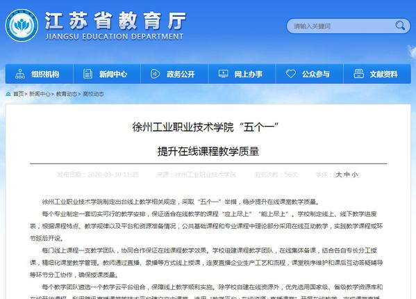 徐州工业职业技术学院制定出台线上教学相关规定,采取“五个一”举措,稳步提升在线课堂教学质量。