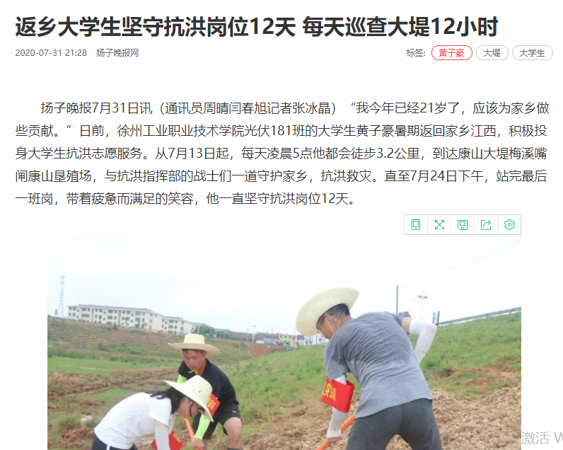 暑假期间,徐州工业职业技术学院光伏181班的大学生黄子豪暑期返回家乡江西,积极投身大学生抗洪志愿服务。从7月13日起,每天凌晨5点他都会徒步3.2公里,到达康山大堤梅溪嘴闸康山垦殖场,与抗洪指挥部的战士们一道守护家乡,抗洪救灾。直至7月24日下午,站完最后一班岗,带着疲惫而满足的笑容,他一直坚守抗洪岗位12天。