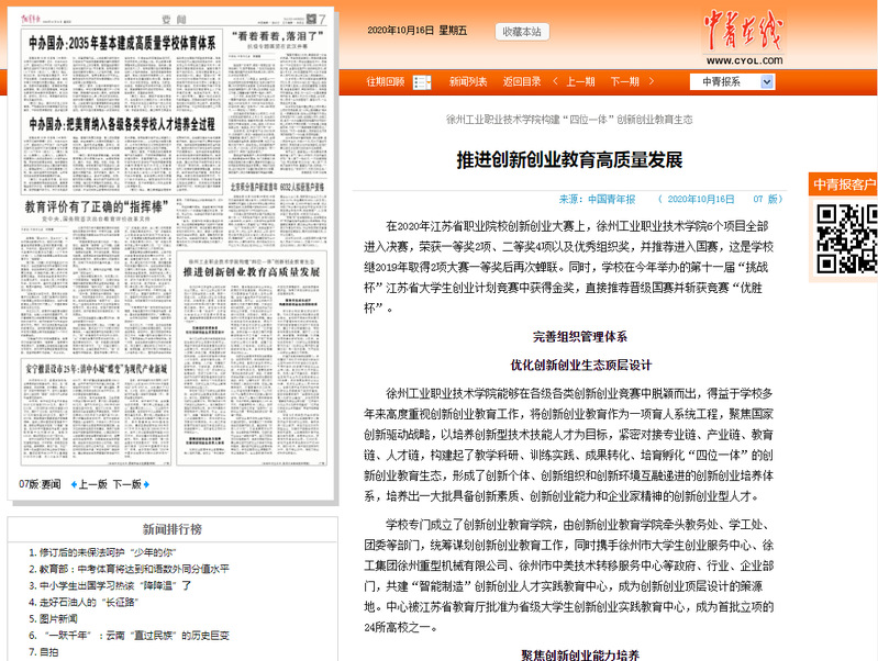 徐州工业职业技术学院能够在各级各类创新创业竞赛中脱颖而出,得益于学校多年来高度重视创新创业教育工作,将创新创业教育作为一项育人系统工程,聚焦国家创新驱动战略,以培养创新型技术技能人才为目标,紧密对接专业链、产业链、教育链、人才链,构建起了教学科研、训练实践、成果转化、培育孵化“四位一体”的创新创业教育生态,形成了创新个体、创新组织和创新环境互融递进的创新创业培养体系,培养出一大批具备创新素质、创新创业能力和企业家精神的创新创业型人才。