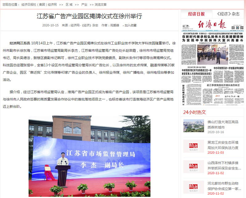 10月14日上午,江苏省广告产业园区揭牌仪式在徐州工业职业技术学院大学科技园隆重举行。徐州市副市长徐东海,江苏省市场监管局副局长李杰,江苏省市场监管局广告处处长赵荣霞,徐州市市场监管局党组书记、局长吴德法,鼓楼区委副书记韩可,徐州工业职业技术学院党委委员、副院长朱作付等领导出席揭牌仪式。科技园总经理张恒中,全省13个设区市市场监管局分管局长和广告处长,以及徐州市的支点传媒、融道传媒等20家广告企业、园区“靠近我”文化传媒等40家广告企业的负责人、徐州报业传媒、徐州广播电台、徐州电视台等参加活动。