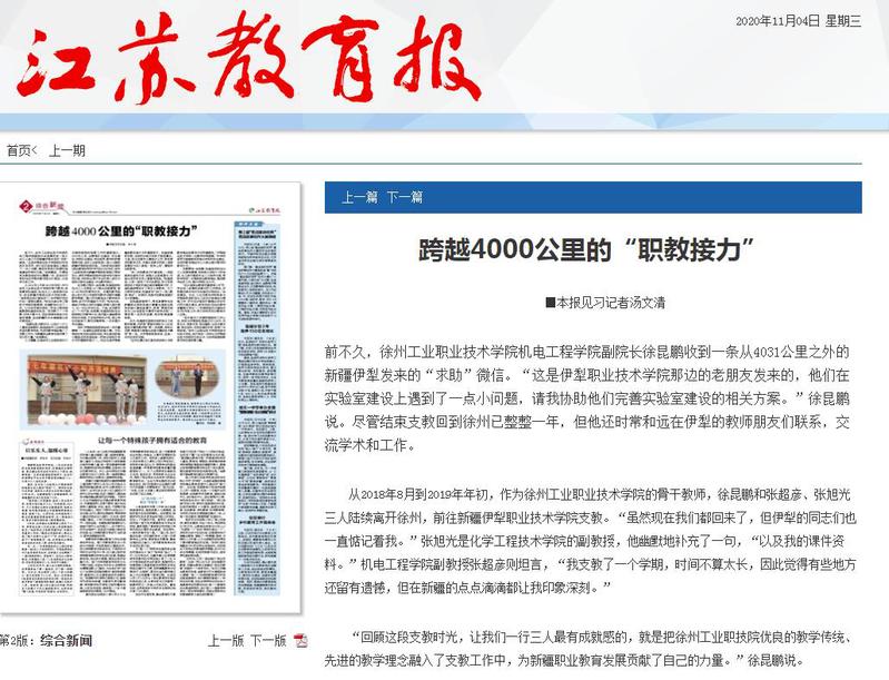 前不久,徐州工业职业技术学院机电工程学院副院长徐昆鹏收到一条从4031公里之外的新疆伊犁发来的“求助”微信。“这是伊犁职业技术学院那边的老朋友发来的,他们在实验室建设上遇到了一点小问题,请我协助他们完善实验室建设的相关方案。”徐昆鹏说。尽管结束支教回到徐州已整整一年,但他还时常和远在伊犁的教师朋友们联系,交流学术和工作。