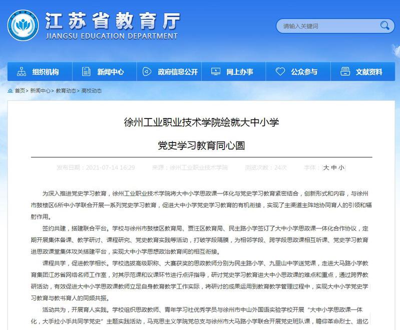 为深入推进党史学习教育,徐州工业职业技术学院将大中小学思政课一体化与党史学习教育紧密结合,创新形式和内容,与徐州市鼓楼区6所中小学联合开展一系列党史学习教育,促进大中小学党史学习教育的有机衔接,实现了主渠道主阵地协同育人的引领和辐射作用。