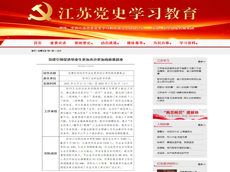 实际成效 | 徐州工业职业技术学院2021届毕业生共计3429人,截至7月20日,已落实毕业去向3149人,毕业去向落实率达91.83%,比去年同期提高8%。近五成毕业生去往国有企业及规模以上企业就业,毕业生就业状况稳定,就业质量取得较大提升。毕业生对学校总体满意度达98.91%,用人单位对对毕业生满意度达91.21%,对学校就业服务工作总体满意度达92.80%,学校在人才培养、教育教学及就业管理服务等方面得到了学生与用人单位的广泛认可。 |