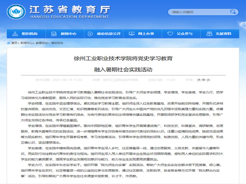 徐州工业职业技术学院将党史学习教育融入暑期社会实践活动,引导广大师生学史明理、学史增信、学史崇德、学史力行,把学习成效转化为奉献国家、服务人民的实际行动,推动党史学习教育走深走实。