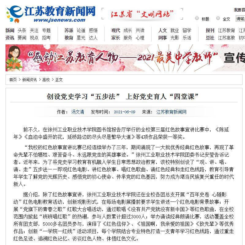 据介绍,除了红色故事宣讲,徐州工业职业技术学院还在全校各团总支开展“百年史卷 心随影动”红色电影教育活动,创新观影形式,在每场电影展播前要求学生讲述一个红色电影背景故事;开展“党旗下的青春之歌”红歌大合唱活动,通过歌唱《没有共产党就没有新中国》等红色歌曲,在全校范围内掀起“班班唱红歌”的热潮,参与人数累计超过3000人;举办诵读经典朗诵比赛,活动覆盖全校所有团支部,5000多名团员参与,演绎了《红色信仰》、《祖国啊,我亲爱的祖国》《致先辈》等优秀作品;创新“一学院一红线”活动项目,每个学院结合专业特色打造一支青年学习红色线路,通过重走红色足迹、追溯红色记忆、访谈红色人物、体悟红色文化。