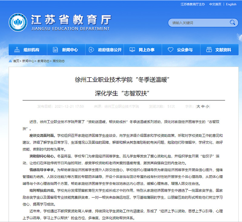 近日,徐州工业职业技术学院开展了“资助送温暖,帮扶助成长”冬季送温暖系列活动,深化对家庭经济困难学生的“志智双扶”。