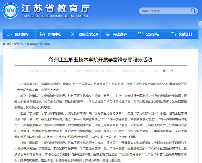 在全国第59个“学雷锋纪念日”暨第23个“中国青年志愿者服务日”到来之际,徐州工业职业技术学院组织各级团学组织开展“我为同学做实事”志愿服务活动。