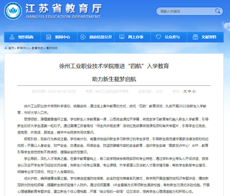 徐州工业职业技术学院科学谋划、统筹安排,通过线上集中教育的方式,依托“四航”教育活动,扎实开展2022级新生入学教育,守好大学入口关。