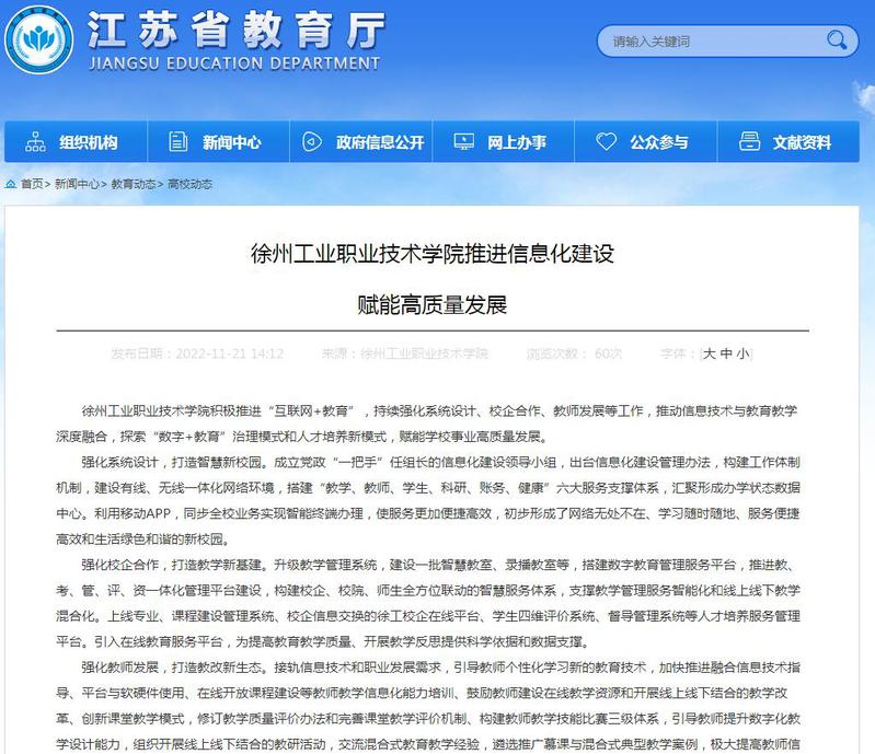 徐州工业职业技术学院积极推进“互联网+教育”,持续强化系统设计、校企合作、教师发展等工作,推动信息技术与教育教学深度融合,探索“数字+教育”治理模式和人才培养新模式,赋能学校事业高质量发展。